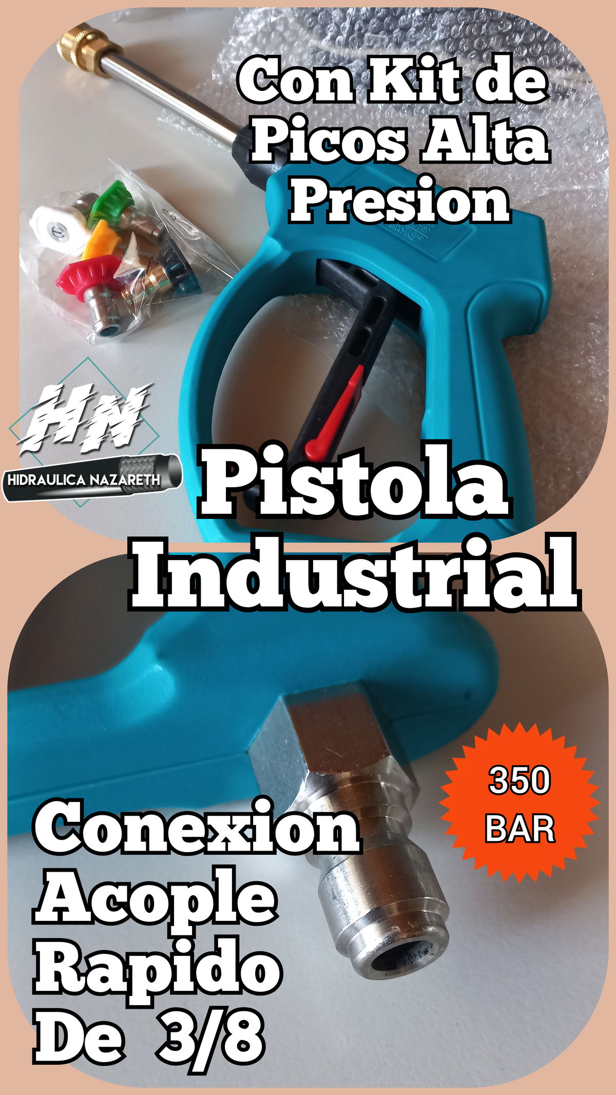 Pistola prifesional de uso intensivo para hidrolavadoras industriales trifasicas, con acople rapido macho de 3/8 de conexion y acople rapido 1/4 en punta de pistola.